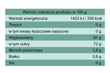 Składniki: miód nektarowy wielokwiatowy 90,5%, pomarańcza liofilizowana 4%, gruszka liofilizowana 3%, cynamon 2%, goździki 0,5%