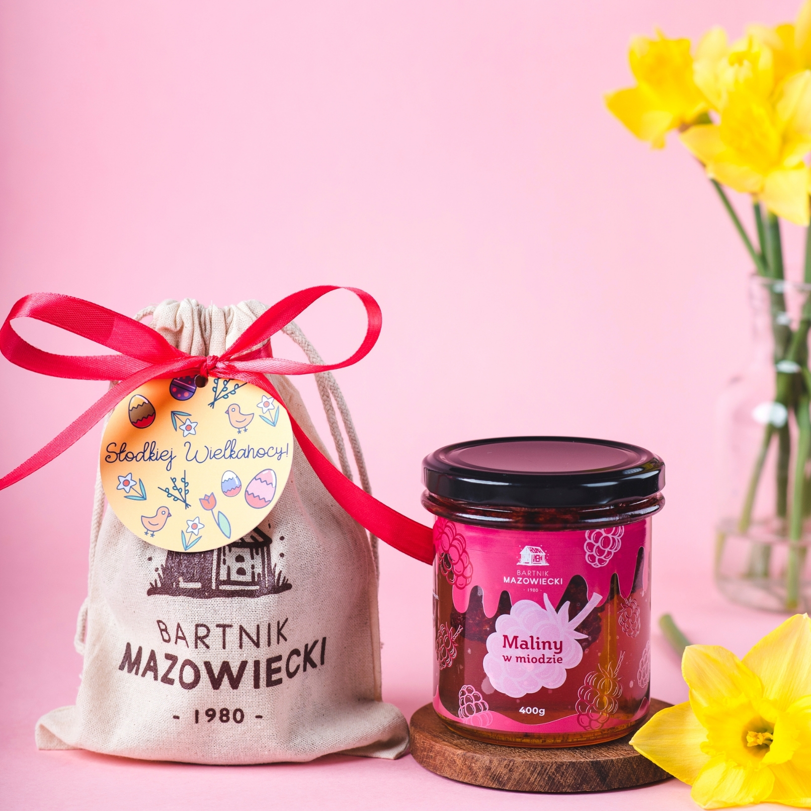 Wybierając ten uroczy drobiazg, otrzymujesz produkt gotowy do wręczenia. Słoiczek ukryty jest w estetycznym, materiałowym woreczku z logo naszej pasieki. Całość przewiązaliśmy piękną wstążką i zwieńczyliśmy żółtym bilecikiem „Słodkiej Wielkanocy”. To piękny i dopracowany zestaw wielkanocny, który wywołuje szczery uśmiech na twarzy. Ty po prostu czekasz, a starannie spakowany upominek od Bartnika Mazowieckiego bezpiecznie dojeżdża prosto pod Twoje drzwi lub do wybranego paczkomatu.