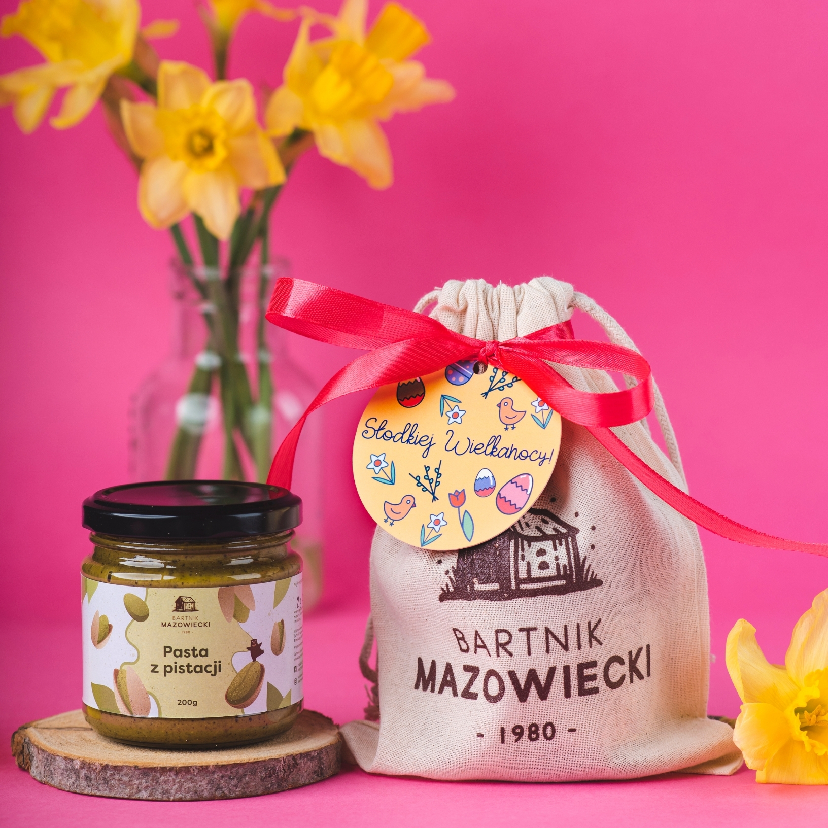 Pasta z pistacji w lnianym worku z biletem i wstążką na Wielkanoc zachwyca intensywnym smakiem prawdziwych pistacji. Świetnie sprawdza się solo albo jako dodatek do słodkich śniadań i deserów – dokładnie tam, gdzie liczy się smak. 100% pistacji w świątecznej odsłonie.