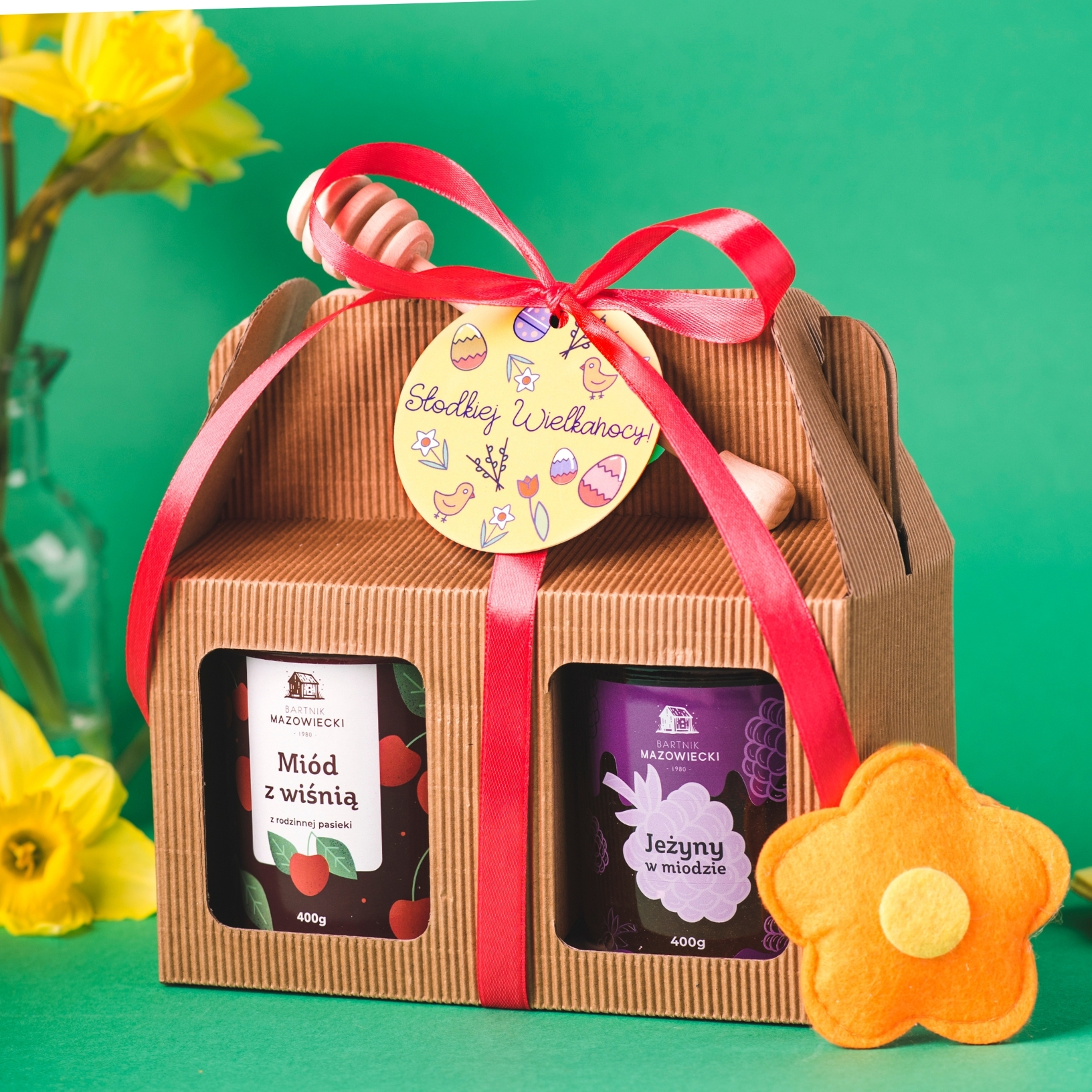 Zestaw miodów i owoców w miodzie na Wielkanoc 2 x 400 g w tekturowym pudełku