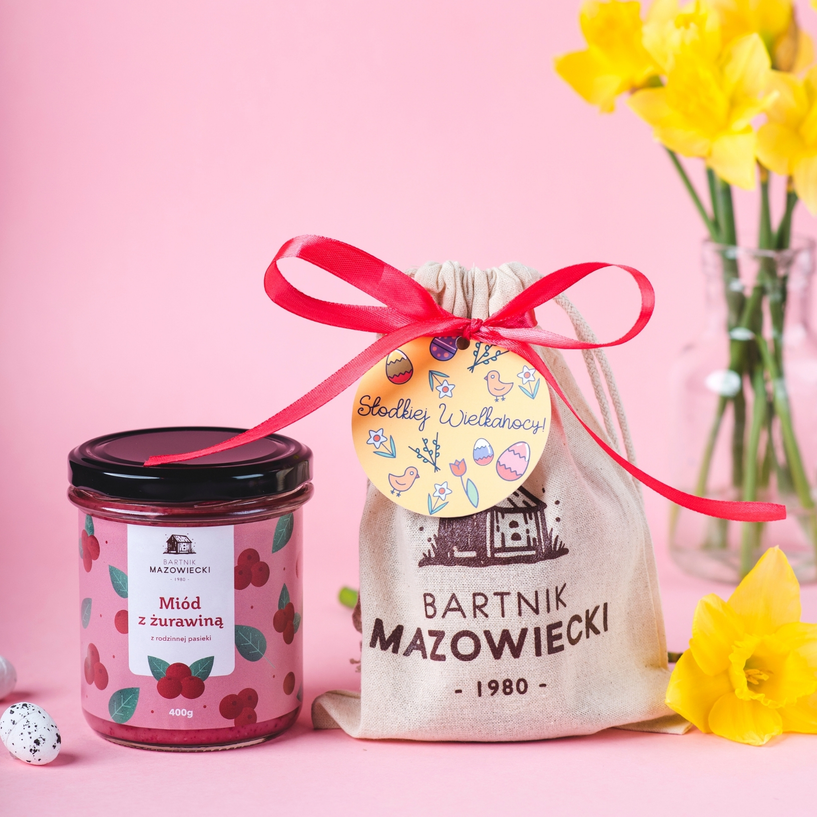 Zamiast błyszczących folii i marketowych opakowań, proponujemy powrót do korzeni. Wybrany przez Ciebie słoiczek ukryliśmy w estetycznym, materiałowym woreczku z logo naszej pasieki. Taka oprawa świetnie oddaje rustykalny, sielski klimat, z jakim kojarzą się domowe święta. Całość ręcznie przewiązaliśmy kolorową wstążką, która fantastycznie ożywia kompozycję i od razu przyciąga wzrok. Dołożyliśmy też okrągły, wiosenny bilecik z radosnym napisem „Słodkiej Wielkanocy”. To kompletny, świąteczny prezent, który zachwyca prostotą.