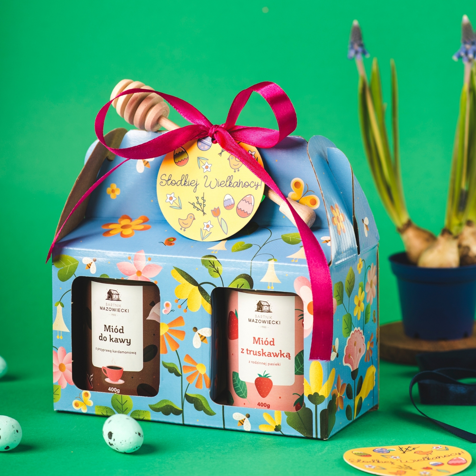 Zestaw z miodami na Wielkanoc to wyjątkowy upominek, który z pewnością stanie się źródłem radości. W komplecie poza wybranymi przez Ciebie 2 słoikami miodu znalazł się także elegancki kartonik oraz wstążka, dzięki czemu nie musisz się martwić pakowaniem prezentu. Dostępne są zarówno klasyczne warianty, jak i miody wzbogacone owocami czy przyprawami.
